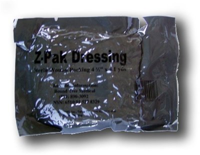 NSN# 6410-01-527-8329 The Z-PAK Dressing is a highly absorbent cotton gauze that is "Z-Folded" for ease in packing wounds. The dressing is sterile and lint-free, and is vacuum-sealed in a 2mm outer pack for greater durability. Inner containment sleeve aids in dispensing and maintains product cleanliness. Dimensions: 4.5" W x 4.1 yds L Dimensions: 5" H x 7.25" W x .5" D (packaged) Weight: 1.3 oz