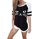 Mlide Cute Cat Print Top,O-...ort Sleeve Blouse(Black,Large)