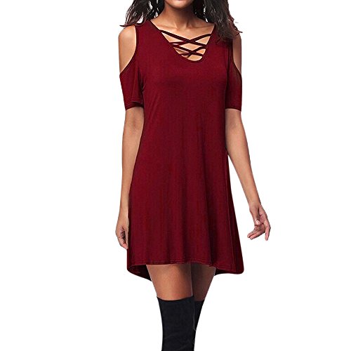 Chaofanjiancai_Dress Women's Cold Shoulder Dress Floral Print Sundress T-Shirt Dress for Summer with Pockets Loose Casual Mini Dress (XL, Red T-Shirt Dress)