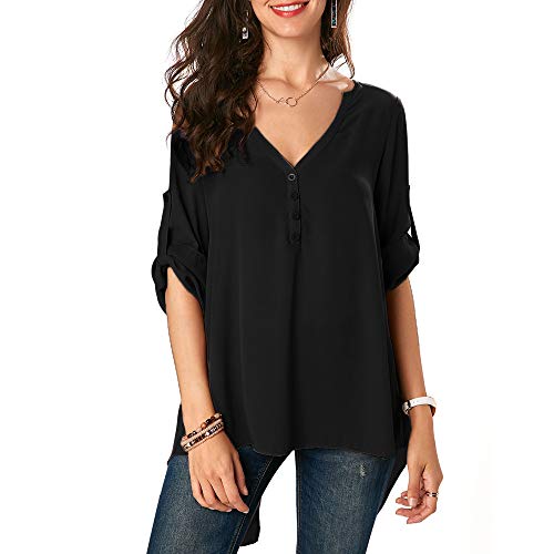 HHei_K Womens Casual Plain V Neck Long Sleeve Slit Hem Button Down Chiffon Tops Shirt