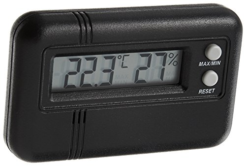 Mini Digital Thermometer Hygrometer Cigar Tobacco Humidors - Reads in Fahrenheit or Celsius, Temperature measurement range is 14-140 F, Humidity measurement range is 10-90%. Error range is +/- 5% - Includes magnetic hanging plate and stand. It is 2.5x1.5"x1/2". Also includes 'minimum' and 'maximum' memory to help you monitor temperature and humidity changes over time. This is very important in large humidors in rooms with variable temperatures since it lets you monitor the high and low reading since you last checked it. TAKES AN LR44 OR 1154 BATTERY (included)