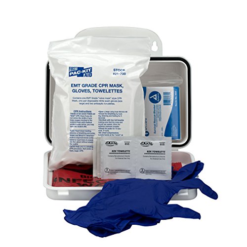 The Pac-Kit 3025 16-piece emergency CPR kit contains two Emergency Medical Technician (EMT) grade CPR face masks, exam gloves, antiseptic wipes, and biohazard bags for providing personal protection from potentially infectious body fluids while performing cardiopulmonary resuscitation (CPR). It also has two emergency blankets to help keep the treated persons warm. The kit comes in a weatherproof plastic case with a carrying handle and holes for wall mounting, and measures 4.50 x 7.50 x 2.75 inches (H x W x D). (H is height, the vertical distance from lowest to highest point; W is width, the horizontal distance from left to right; D is depth, the horizontal distance from front to back.) Refill supplies are sold separately.