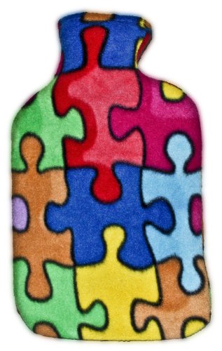 The colorful and cuddly puzzle pieces covered hot water bottle is fabulous to use for aches and pains, muscular tension, stress or cramps. Can't sleep on a cold night? A cozy hot water bottle will work its magic. Cold feet? Hot water bottles keep your feet warm and comfortable. Warm up your bed before settling in at night. They are also so easy to travel with, especially on a long flight or bus ride. The cover is made from machine washable fleece and built for long lasting use. This hot water bottle will keep you warm for years. Comes with a thermoplastic classic hot water bottle that retains heat for an extra long time. Bottle made in Germany. Cover made in the USA.12 inches x 7.25 inches & holds 2 liters of water.